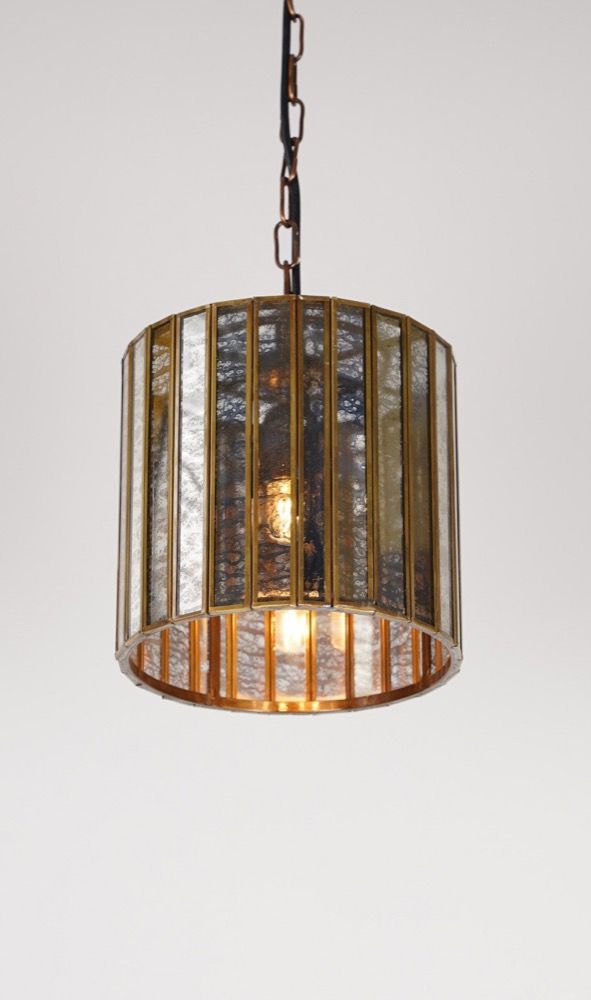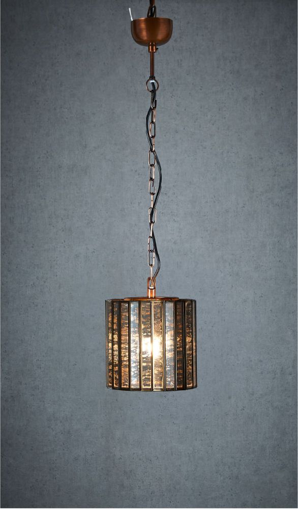 Our Balfur glass hanging lamp is magnificently crafted in a stunning design. This beautiful cylinder pendant features mercury mirror glass light with a stunning bronze metal cage and will be perfect statement piece for living space. Crafted from mercury glass, it offers two different looks when switched on or off. Light shines through the glass to create glowing effect. The suspension cord and chain are adjustable with metal string to ensure this pendant is hung at required height.