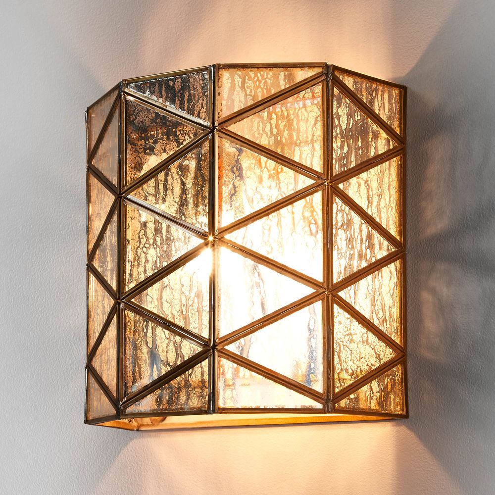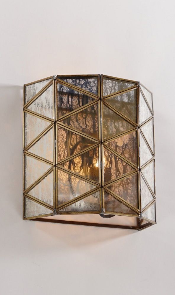 Our Butterworth lamp is geometric architectural lines wall sconce that bring visual interest to any modern interior with soft, glowing light through the triangular glass panels. Crafted from mercuried glass, it offers two different looks when switched on or off. Light shines through the distress accents in the glass to create glowing effect.