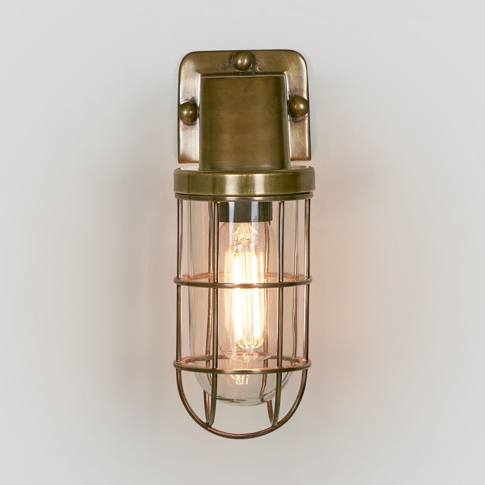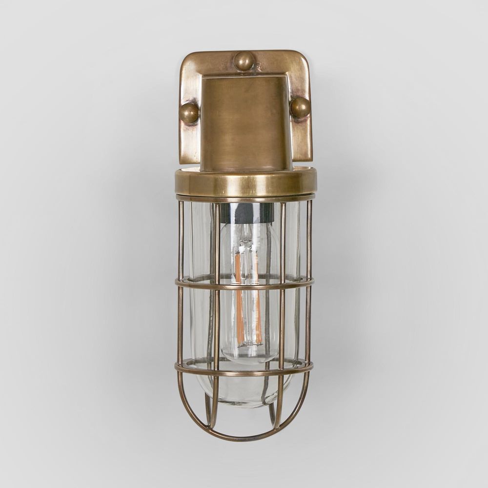 Our Royal London wall light is IP-rated 54 wall sconce with clear glass and brass metal cage, which suitable for indoor and outdoor use. This lantern style wall lamp is used mainly for outdoor garden lamp, patios and entryways. With sleek appearance, it can also be used in bathroom as side mirror lights to match any industrial, rustic or loft-style décor. Its caged enclosure houses a standard bulb or an antique-style filament that mimics the glow of a warmly lit station.