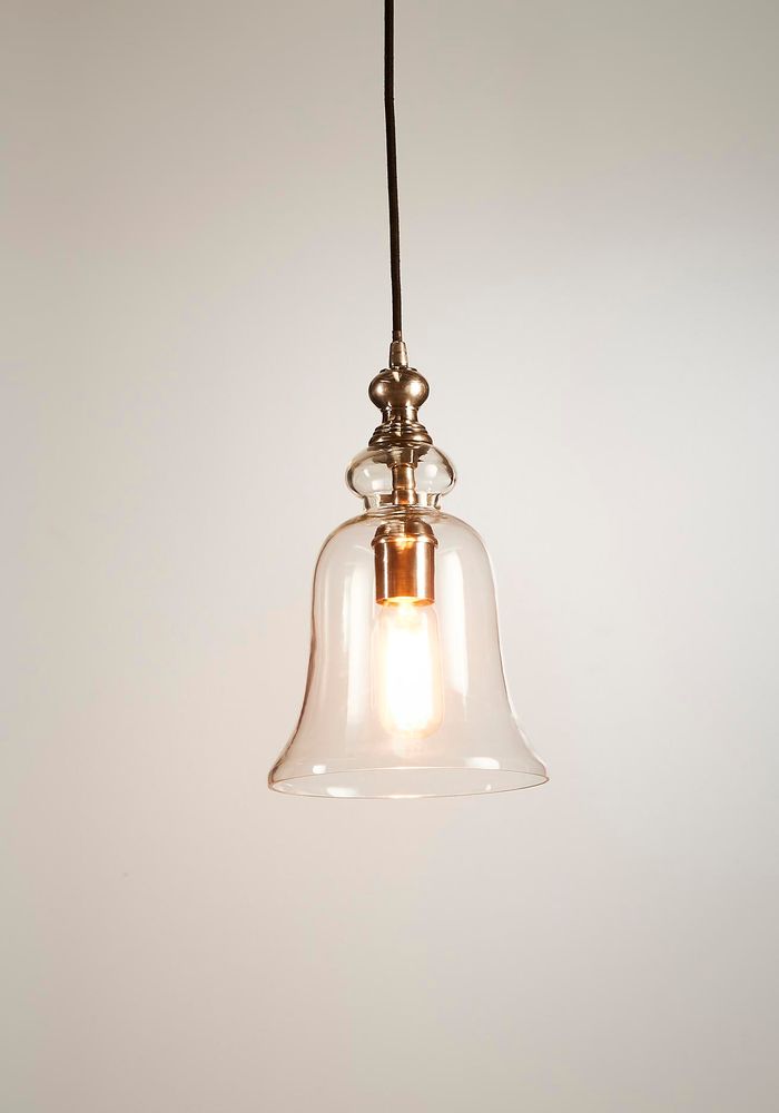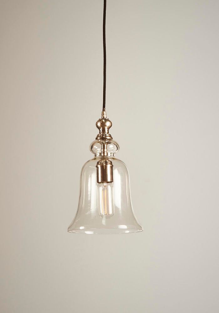 Tivoli is hanging lamp with clear glass with bell shape adds soft modern simplicity over kitchen islands, or even bars. Two sizes are available, small and large. The small one comes with suspension cord only. While the large one comes with chain and cord. Two colours are available, antique silver and brass. Truly gorgeous transparent glass shade which is significant point of this sleek modern fixture.