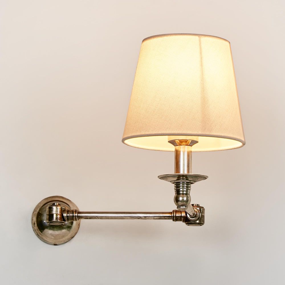 Our Portland is industrial swing-arm wall light in antique brass or silver to create attractive and functional way to add light to bedside or favorite seating area. With round backplate and swing arm, these will result rich warm and authentic aged look and feel which cannot be replicated. Recommended fabric lamp shade is with diameter 7 or 8 inch on bottom, and recommended lamp bulb is candle shape type of globe. Similar items with metal shade instead is also available and can be searched with name Portland wall light with metal shade.
