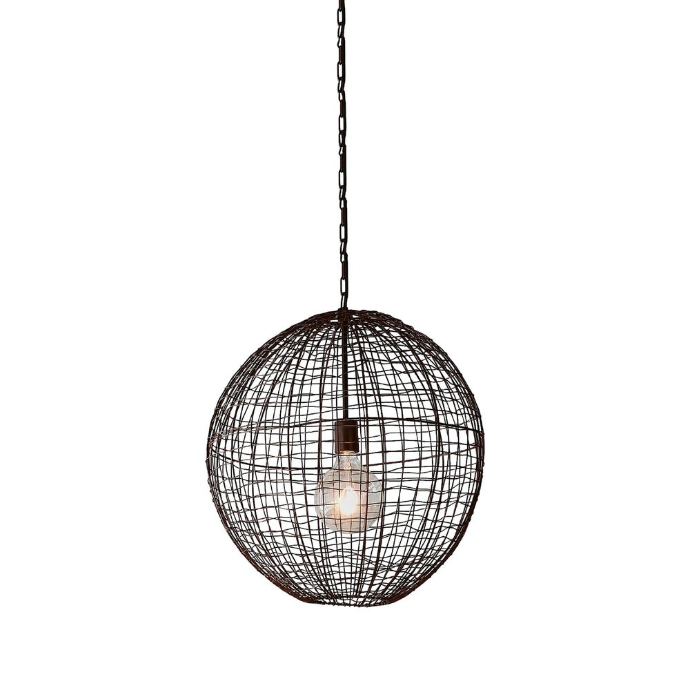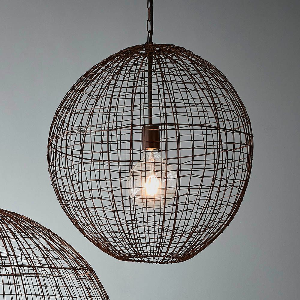 An open wire weave pendant in rust finish that creates visual interest while maintaining an open feel to the room. The design is inspired by cray fishing traps