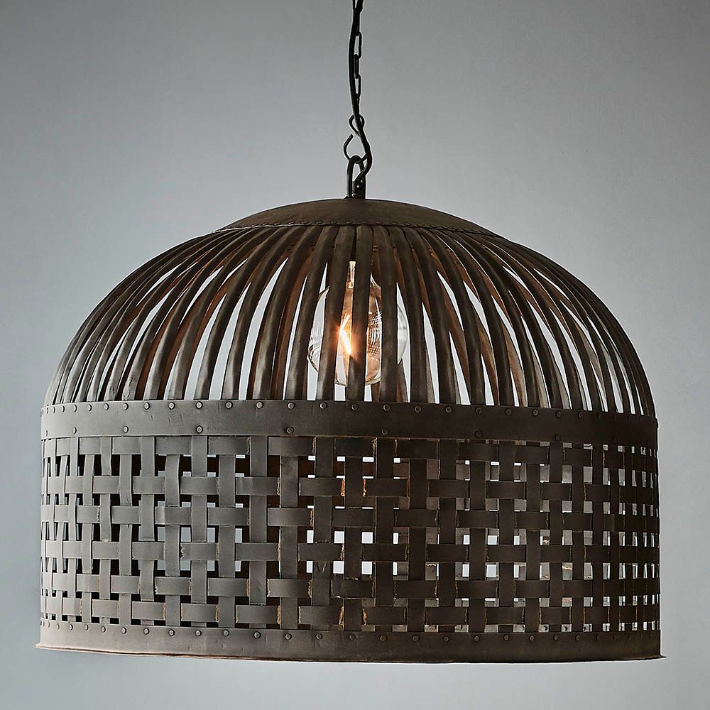 Esch features individual lengths of iron strips that are woven together and held in place by rivets, suspended beneath a graceful dome.