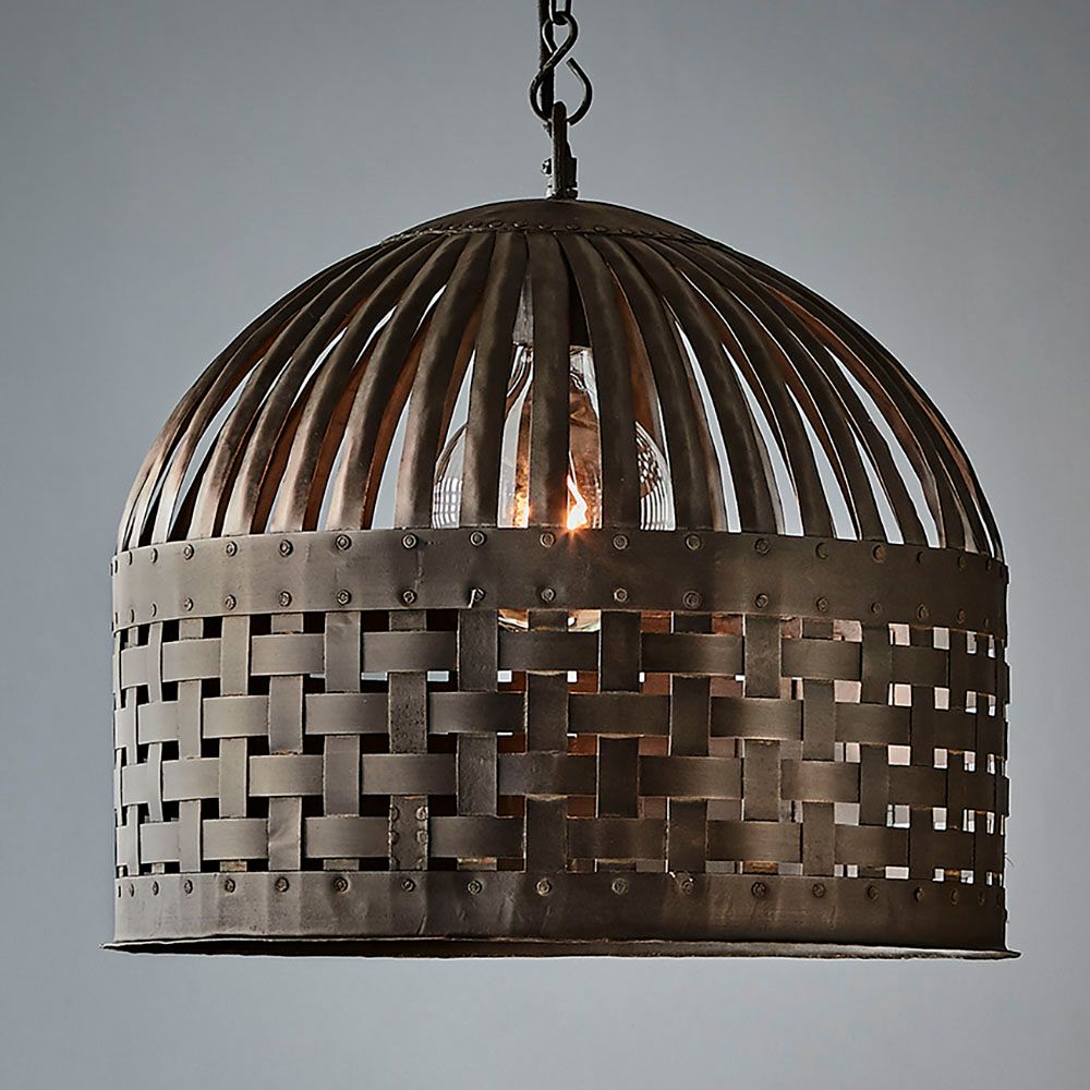 Esch features individual lengths of iron strips that are woven together and held in place by rivets, suspended beneath a graceful dome.