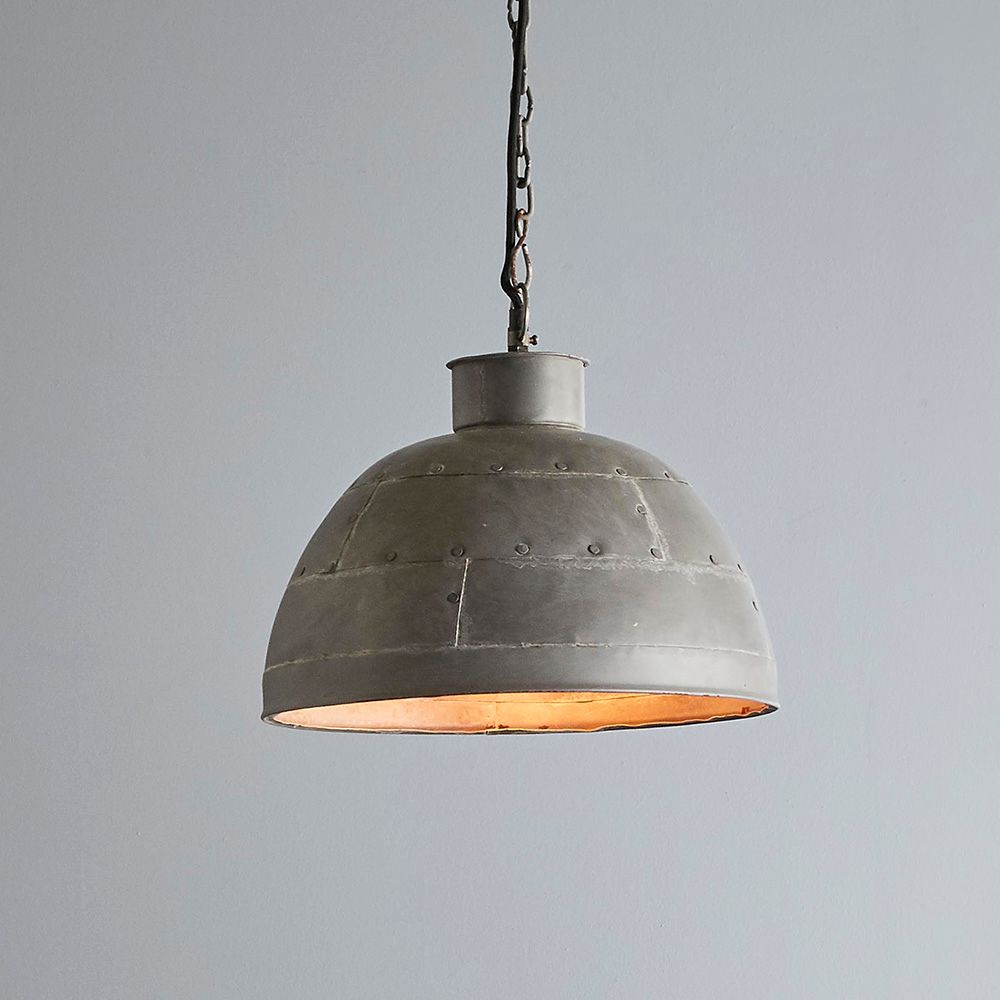 A riveted dome pendant in two rustic finishes. This pendant is designed to patina over time for a vintage aesthetic.