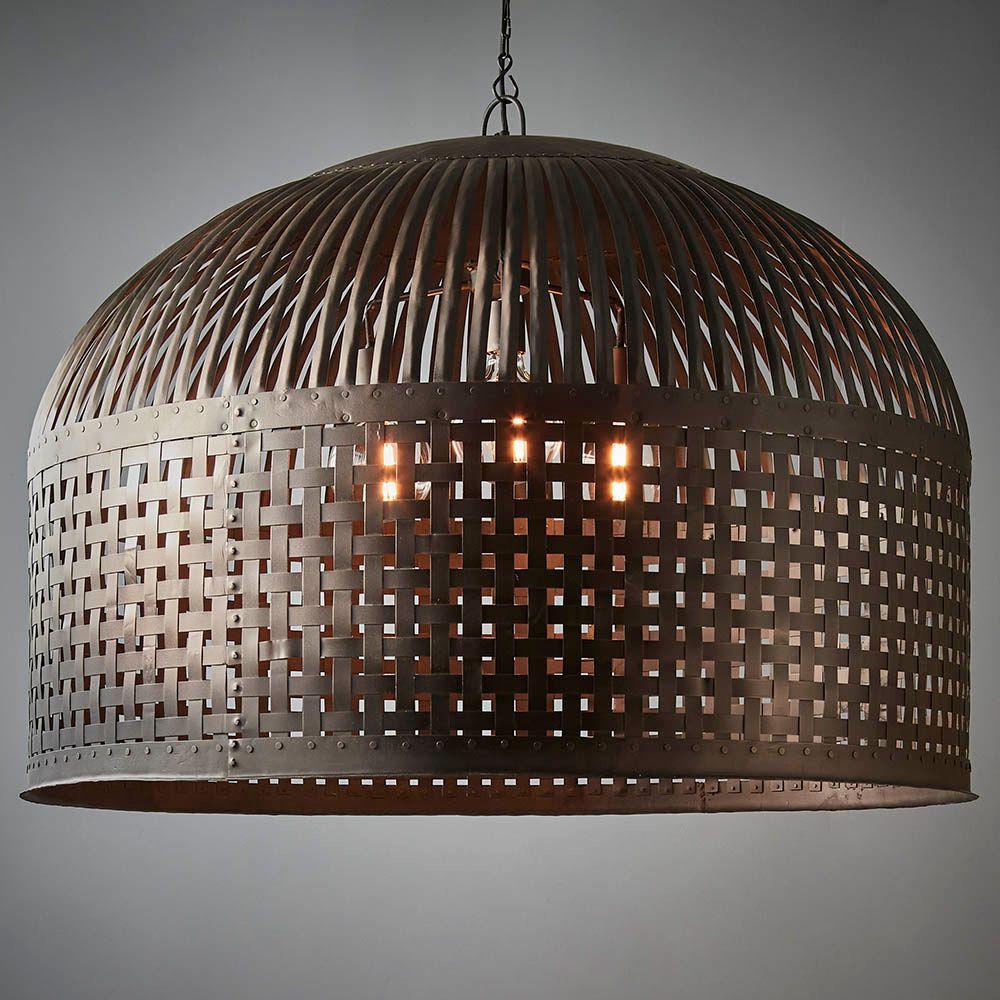 Esch features individual lengths of iron strips that are woven together and held in place by rivets, suspended beneath a graceful dome.
