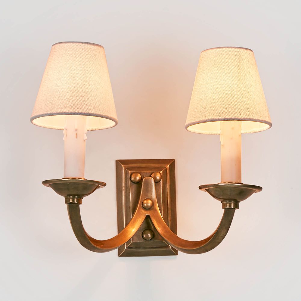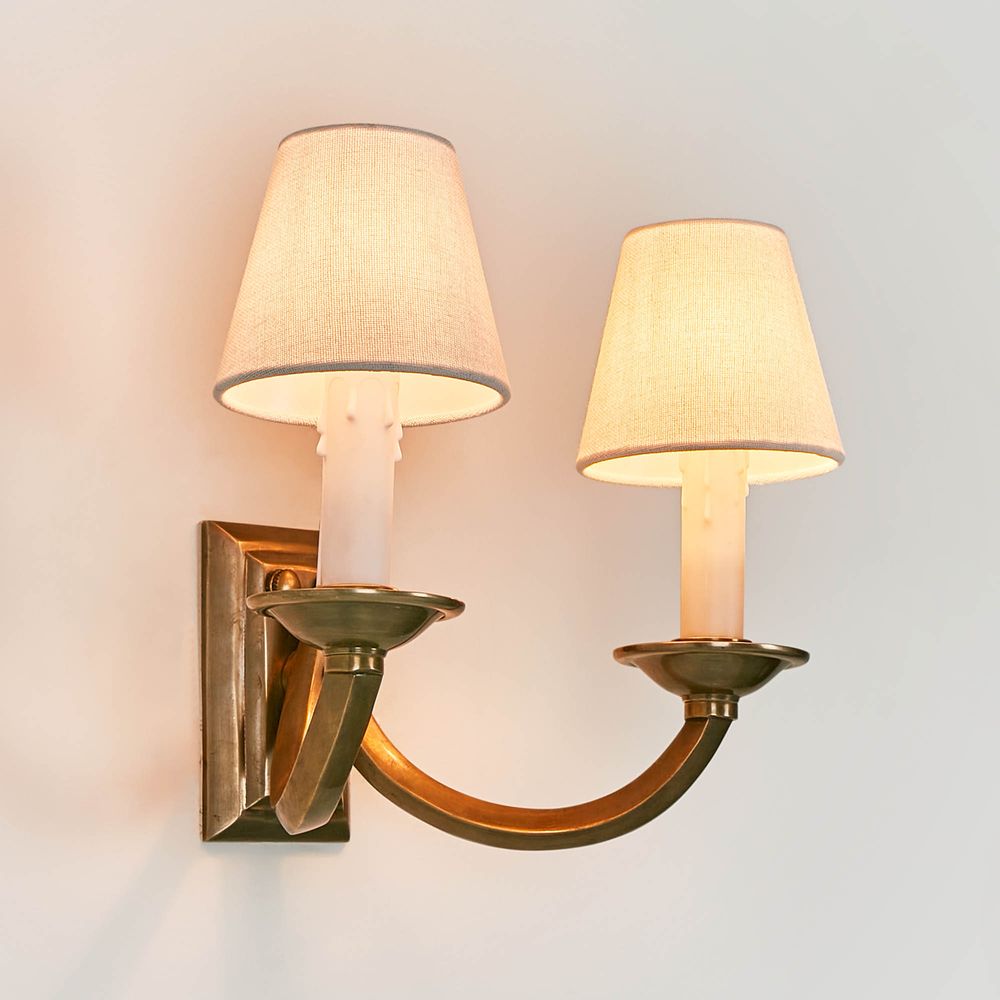 Our Elysee lamp is traditional Victorian design twin arm wall light in antique brass or silver, with choice of coloured shades for the perfect combination and add character to older homes. With rectangular backplate, curve arm and cream candle sleeve, these will result rich warm and authentic aged look and feel which cannot be replicated. Recommended fabric lamp shade is clip fitting shade with diameter 5 inch on bottom, and recommended lamp bulb is candle shape type of globe.