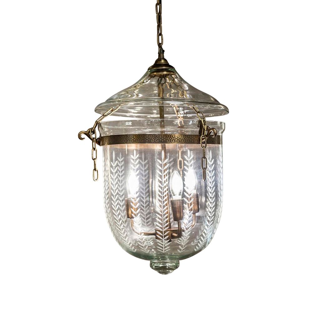Our bell-jar lamp is vintage Georgian style clear glass hanging pendant lantern suspended by chains from a glass cover and brass ring. Three light interior cluster lights. This light is ideal for high ceiling and stairwell lighting and will provide good level of illumination in the area. The height can be adjusted when fitting by removing links from upper link chain. The glass in this fitting is mouth-blown and has intricate hand-cut work with a fern detail.
