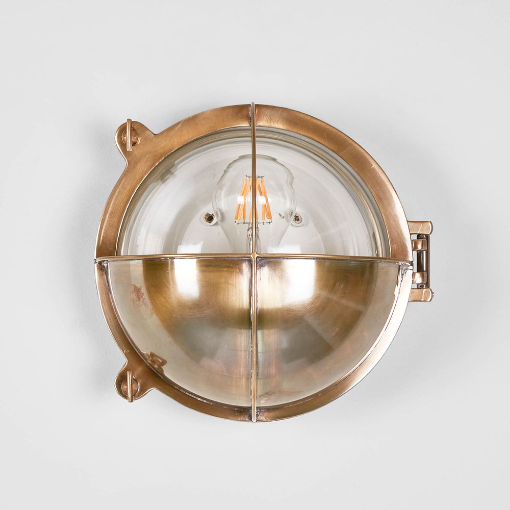 Our Vienna outdoor wall lamp is marine nautical wall light with half round metal cover with clear glass that adds nautical charm into indoor or outdoor industrial style space. This nautical lighting is perfect to install at beach front properties or pool houses. Perfect to illuminate outdoor areas like porches and patios as well as for home’s interior design, brightening hallways and bathrooms. This metal industrial flush mount lighting fixture is also perfect for urban homes, restaurants, bars and hotels.