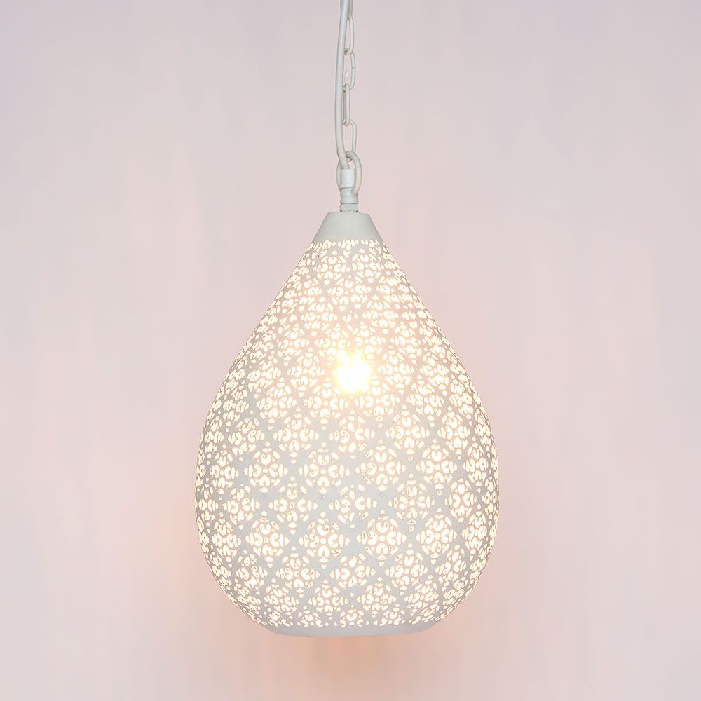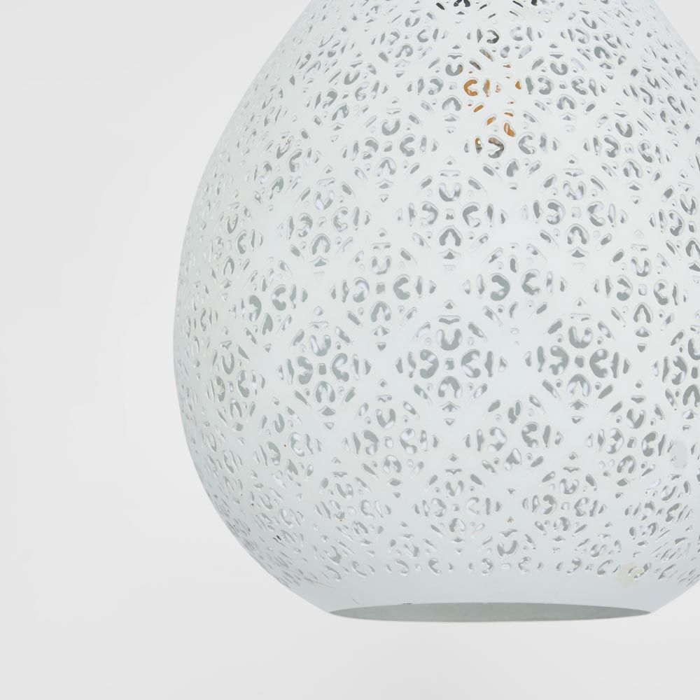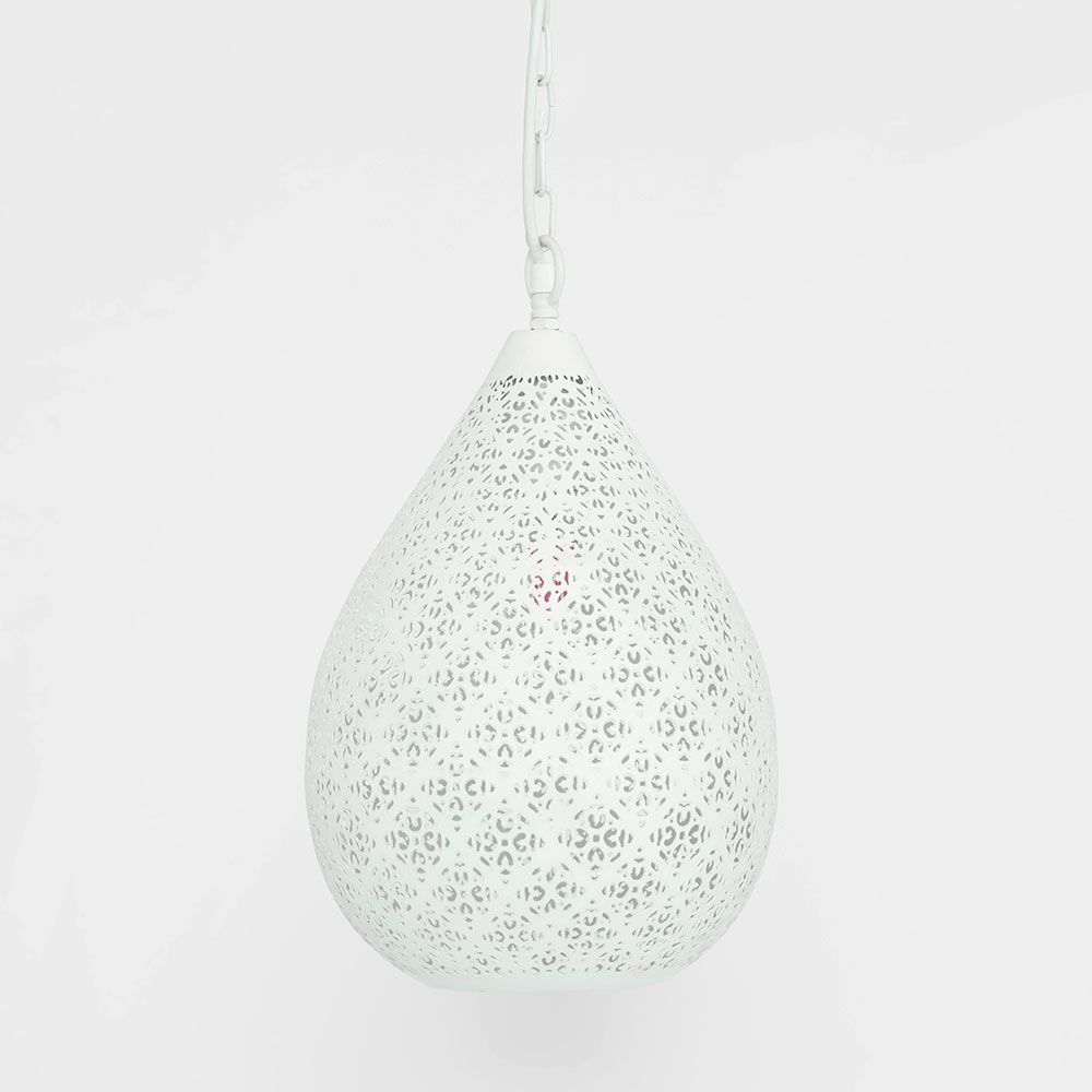 A small teardrop pendant featuring a delicately-patterned perforated matt white shell.