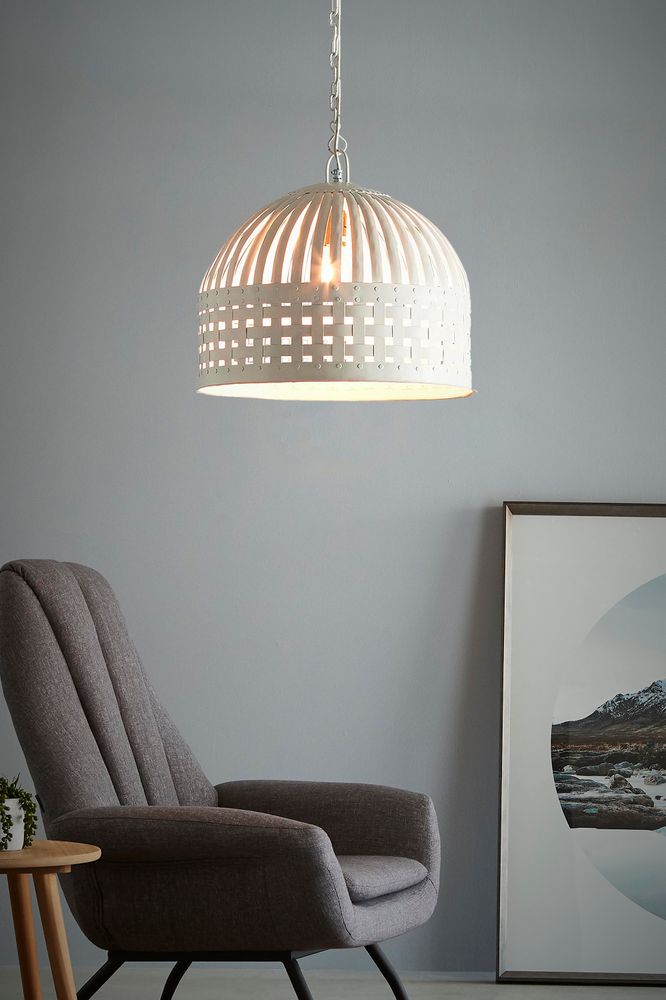 Cast a spell of industrial allure in any room with our Small Esch Ceiling Pendant in Antique White. Crafted with an intricate iron cage design, this pendant features individual lengths of iron strips woven together and held in place by rivets, creating a captivating play of light and shadow. Suspended beneath a graceful dome and adjustable metal chain, it's the perfect statement piece for adding sophistication to your living area, dining area, or covered outdoor space, casting a warm and inviting glow wherever it hangs.