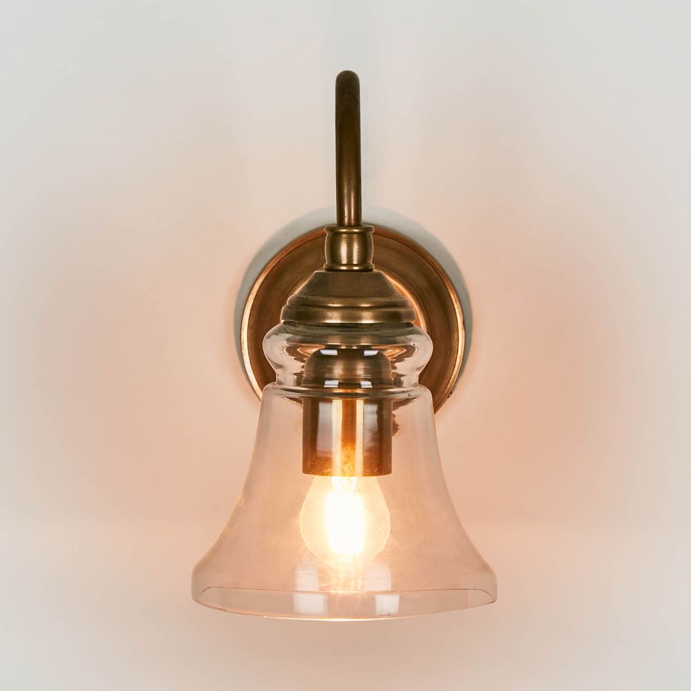 Our Plaza lamp is classic Victorian wall sconce with clear glass shade that perfect to be installed beside mirrors such in vanity and dressing room. This quality brass wall light with natural tarnish is fixed to the wall on circular aged brass back plate and has decorative curved arm which carries the light. The fitting can be installed facing up and down.