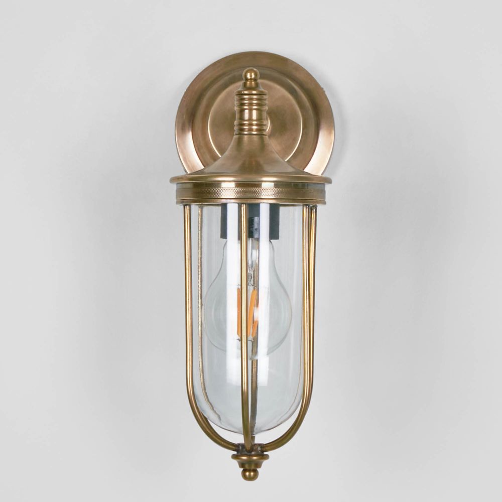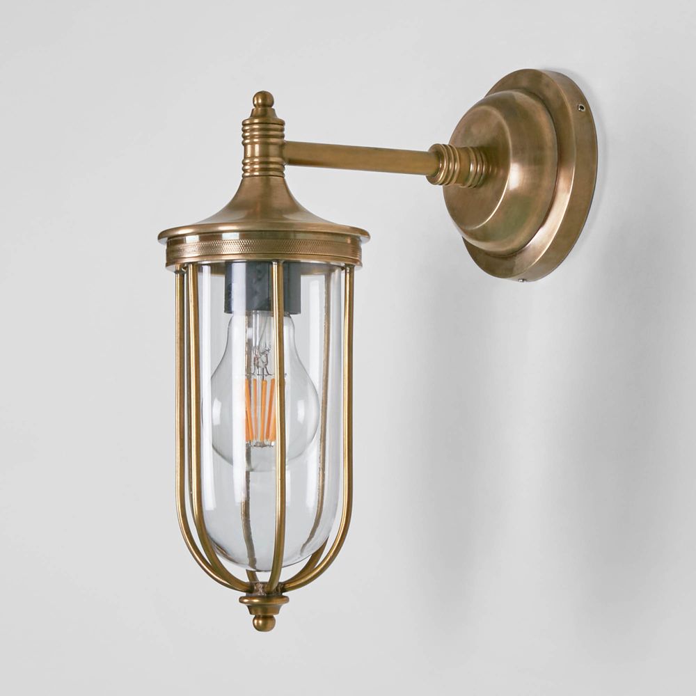 Our Noosa wall light is IP-rated 54 outdoor wall sconce with clear glass and brass metal cage, which suitable for indoor and outdoor use. This lantern style wall lamp is used mainly for outdoor garden lamp, patios and entryways. With sleek appearance, it can also be used in bathroom as side mirror lights to match any industrial, rustic or loft-style décor. Its caged enclosure houses a standard bulb or an antique-style filament that mimics the glow of a warmly lit station.