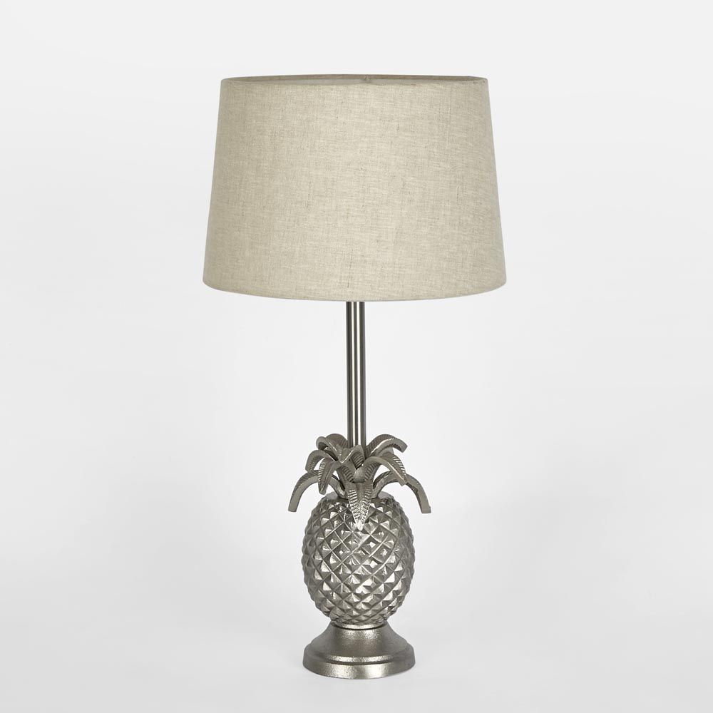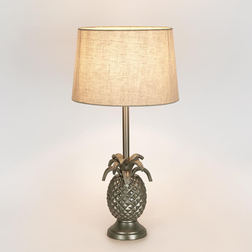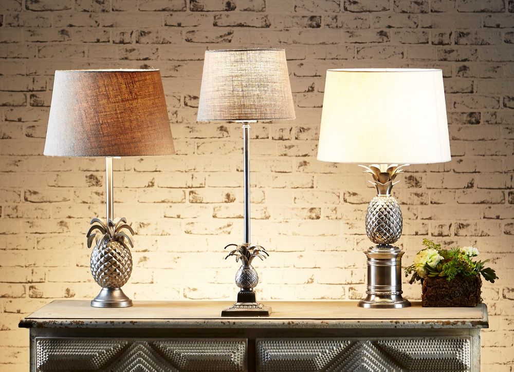 Our Pineapple table lamp has been very popular and become a symbol of hospitality in a sense of welcoming. The spiked leaves add eye-catching appeal to the detailed pineapple base. Two colours are available which are antique silver and brown. Lamp shade that suit for silver base is black or off white linen. For the brown colour, the base will match with natural linen shade.