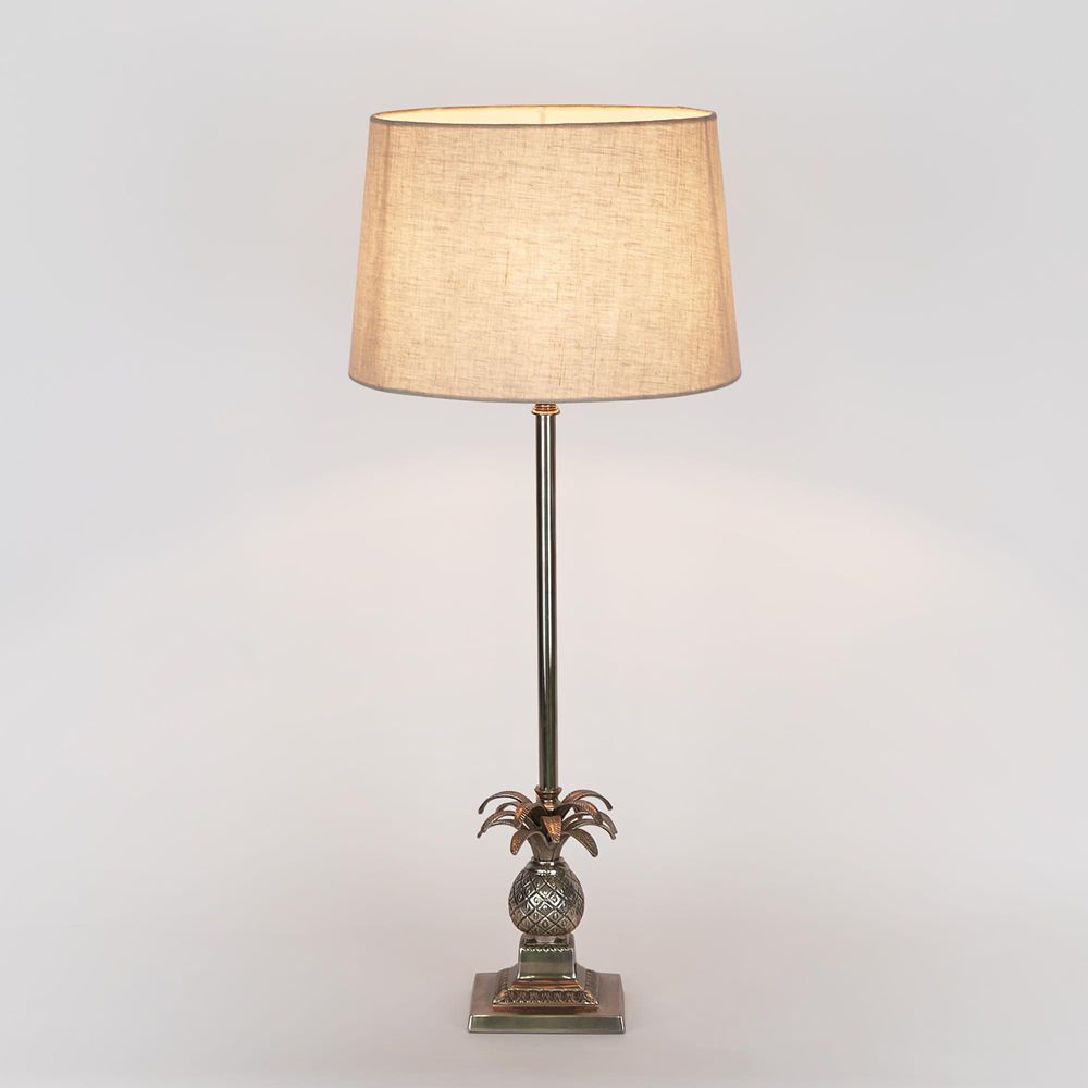 Our Pineapple table lamp has been very popular and become a symbol of hospitality in a sense of welcoming. The spiked leaves add eye-catching appeal to the detailed pineapple base. Two colours are available which are antique silver and brown. Lamp shade that suit for silver base is black or off white linen. For the brown colour, the base will match with brown basket weave shade.