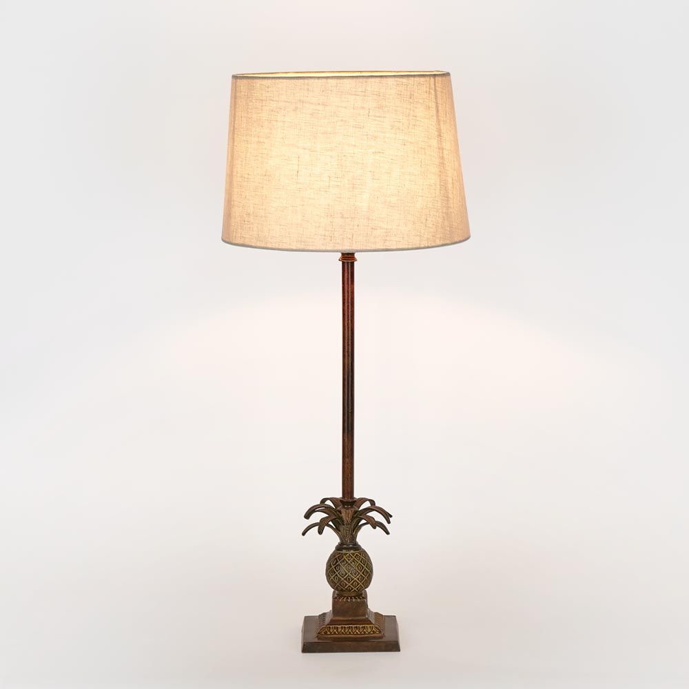 Our Pineapple table lamp has been very popular and become a symbol of hospitality in a sense of welcoming. The spiked leaves add eye-catching appeal to the detailed pineapple base. Two colours are available which are antique silver and brown. Lamp shade that suit for silver base is black or off white linen. For the brown colour, the base will match with brown basket weave shade.