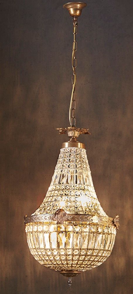 This is antique brass Empire chandelier with hand-cut beveled glasses shaped like crystal glass. There are four different sizes but only with large and extra-large ones have round ball shape on top fitting. The brass has patina to look like old world vintage traditional appearance. The light shades out of the chandelier will look beautiful anywhere to make our guests to feel welcome in our home.