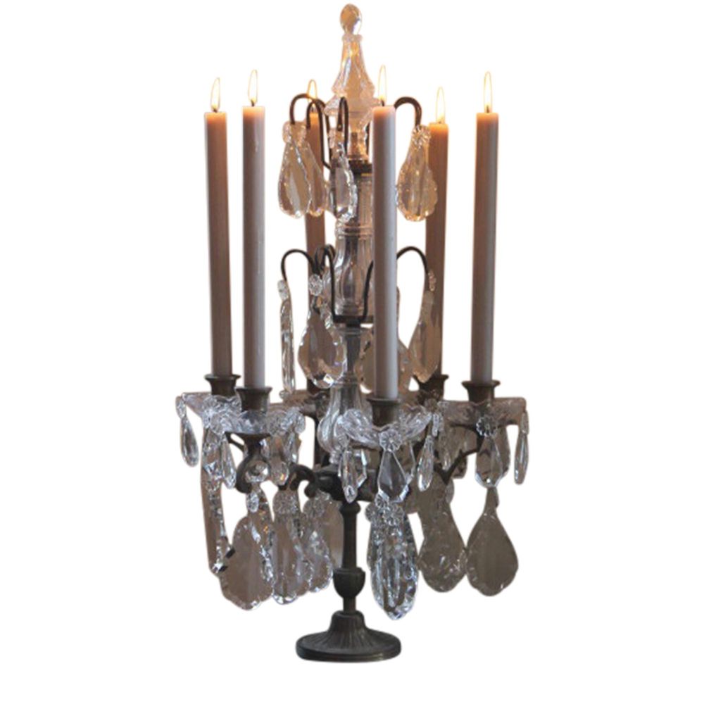Estella small candelabra is a magnificent piece of french designed décor. It is handmade from crystal glass and heavy burnished brass. It makes an extraordinary centrepiece, it has 6 taper candle holders and several hanging glass chandelier crystals hanging at different height arms to draw in the light. It is a classic french piece of decor for your formal dinning table or would look incredible on a mantlepiece of entrance table for your entrance hall. INDOOR USE ONLY. CLEAN CAREFULLY WITH A DAMP CLOTH.