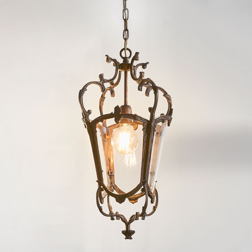 Our Espagnol is decorative French extravagance brass lantern pendant light. This is superb quality brass lantern and the light has 4 glass panels. It is decorated with metal ribbons and it hangs on a brass ceiling rose. The lantern gives a pleasant light when lit and an ideal centerpiece for traditional and classic interior spaces.