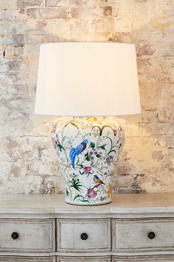 Our Raffles is charming large oriental ceramic base table lamp and has glazed ceramic base in the classic ginger jar style. The lamp is painted with bird and leaf motif on ivory white background. This is elegant lighting for traditional interiors in delightful mix of colours and perfect to sit on center of console table in living or family room.