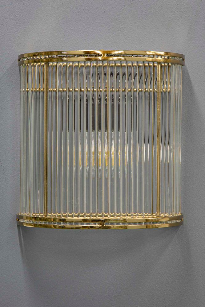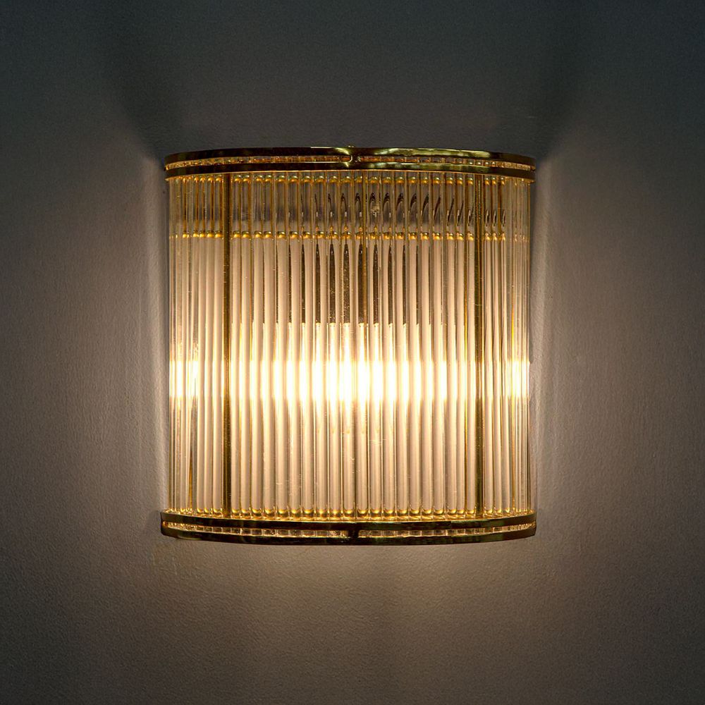 Our Verre wall light is half-round modern accent sconce that made from clear glass tubes with selection of polished nickel or brass frame metal top and bottom. The glass tubes diffuse light beautifully and produce amazing round reflection on the on the glasses. This wall light will instantly upgrade your foyer, bedroom or living room.