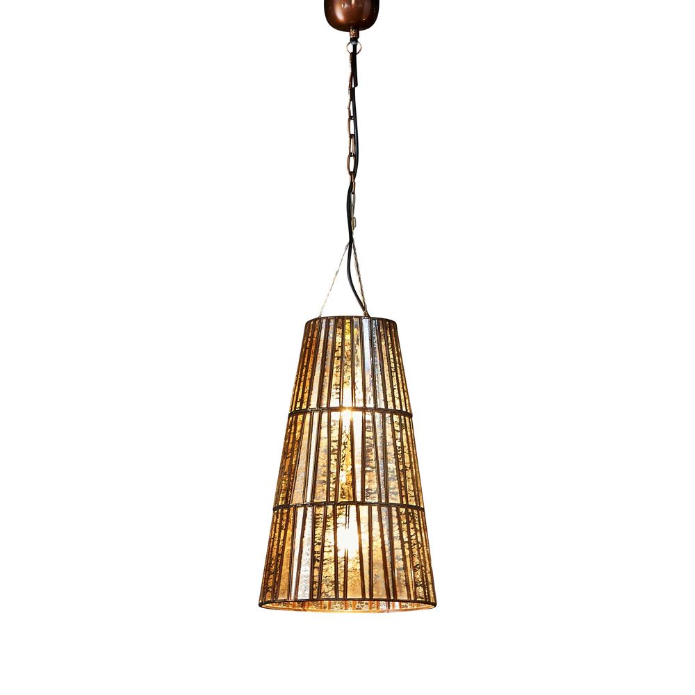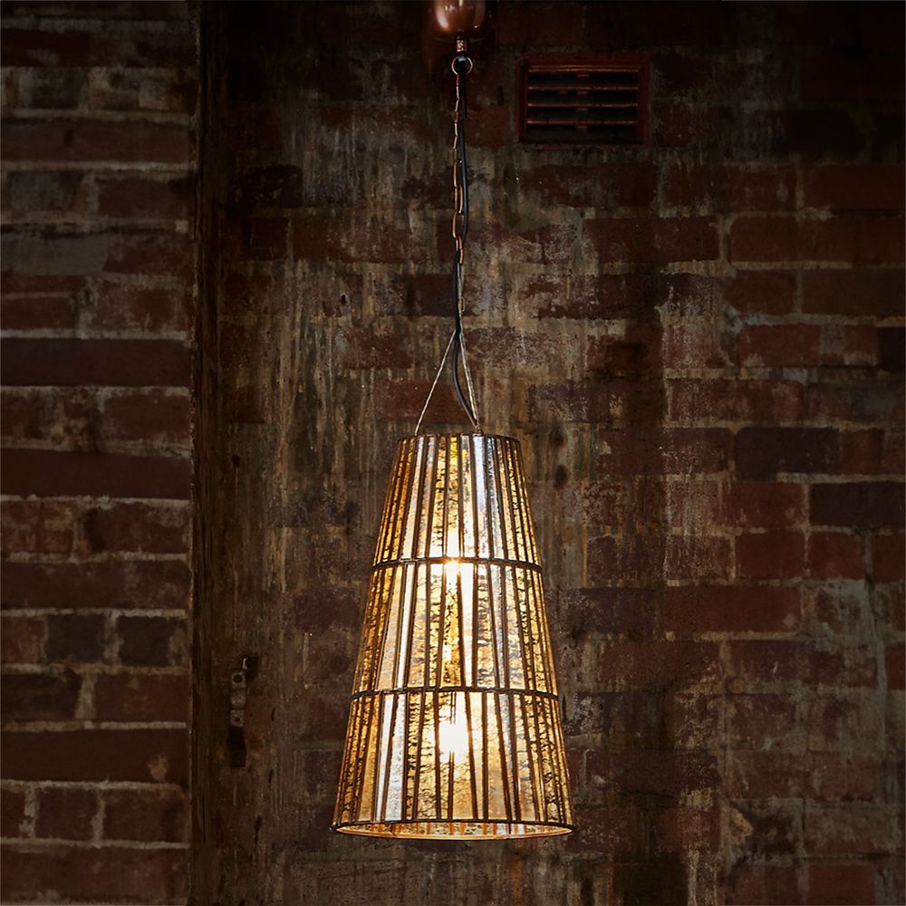 Our Cleveland large glass hanging lamp is magnificently crafted in a stunning design. This beautiful conical pendant features glamorous mercury mirror glass light with a stunning bronze metal cage and will be perfect statement piece for living space. Crafted from mercury glass, it offers two different looks when switched on or off. Light shines through the distress accents in the glass to create glowing effect.