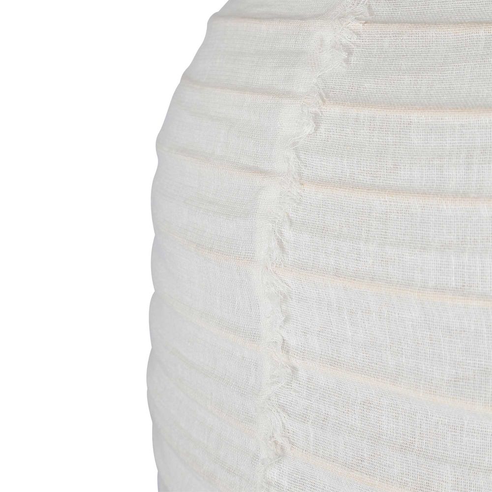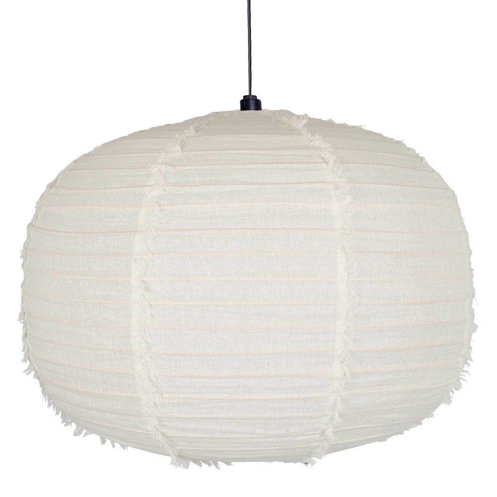 Its round, globe-shaped linen shade showcases hand frayed edges, imparting a rustic charm.