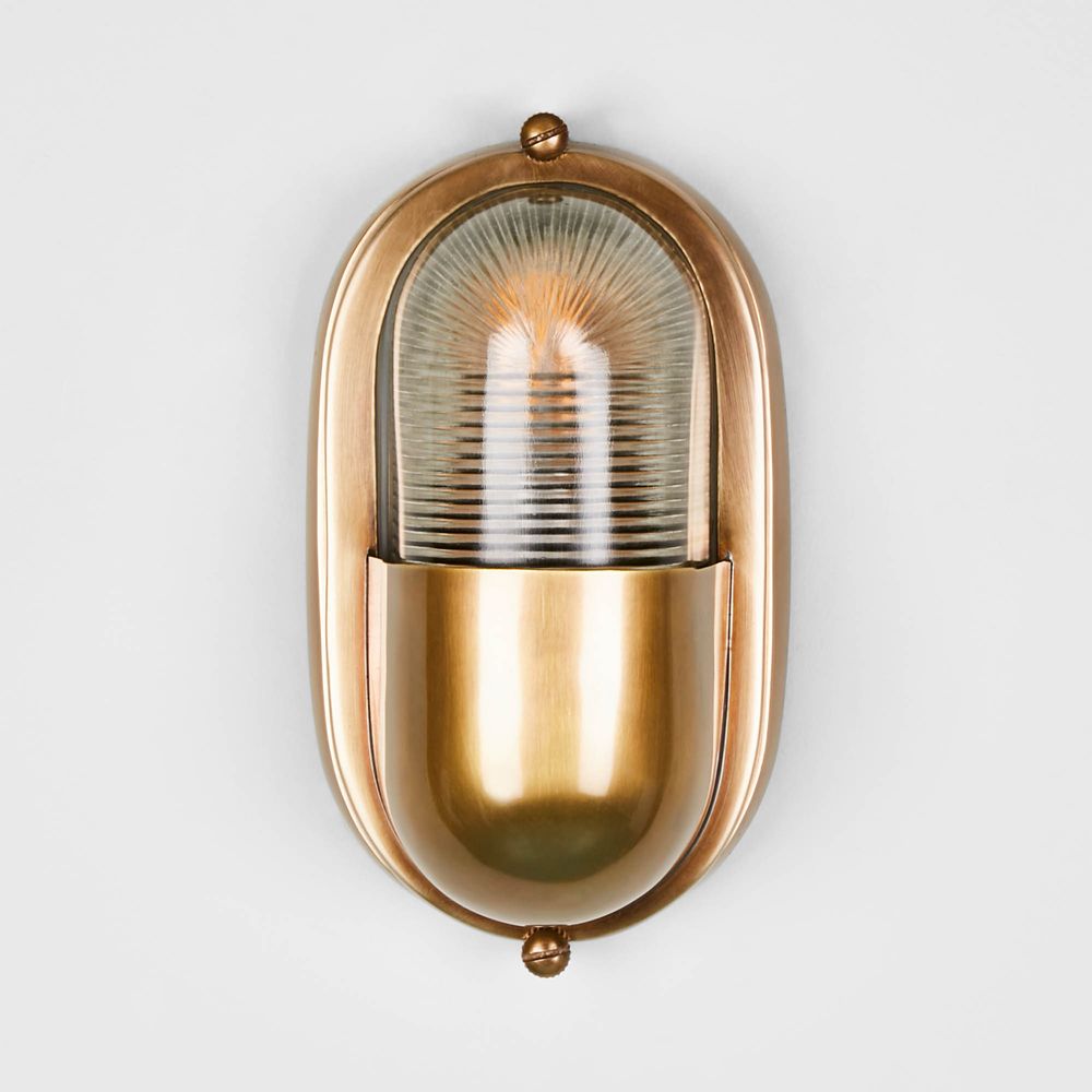 Our Anchor wall light is IP-rated 54 outdoor wall sconce with clear rib glass and brass metal cover, which suitable for indoor and outdoor use. The wall mount makes it perfect décor for outdoor garden lamp, patios and entryways. The light is well built and solid, also anti-rust. It can also be installed vertically or horizontally position. With sleek appearance, it can also be used in bathroom as side mirror lights to match any industrial, rustic or loft-style décor.