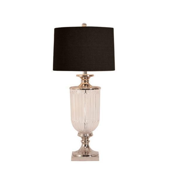 This lamp offers understated luxury. The clear glass base is accented with plated iron and nickel for a glamorous look. Then, the design is completed with a smart black linen shade for just the right amount of drama.