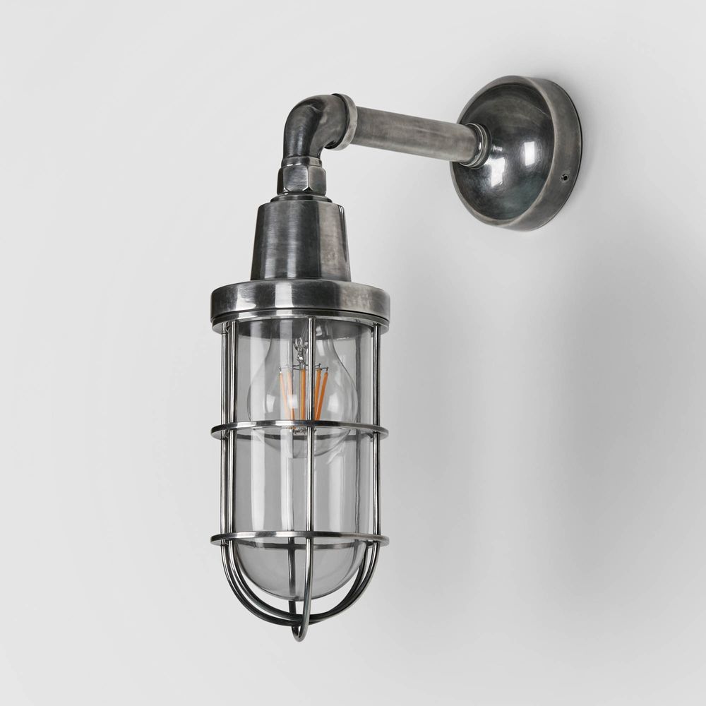 Our Starboard wall light is IP-rated 54 wall-sconce with clear glass and brass metal cage, which suitable for indoor and outdoor use. This lantern style wall lamp is used mainly for outdoor garden lamp, patios and entryways. With sleek appearance, it can also be used in bathroom as side mirror lights to match any industrial, rustic or loft-style décor.