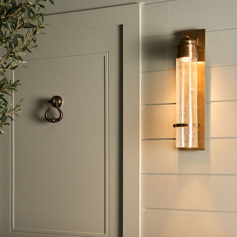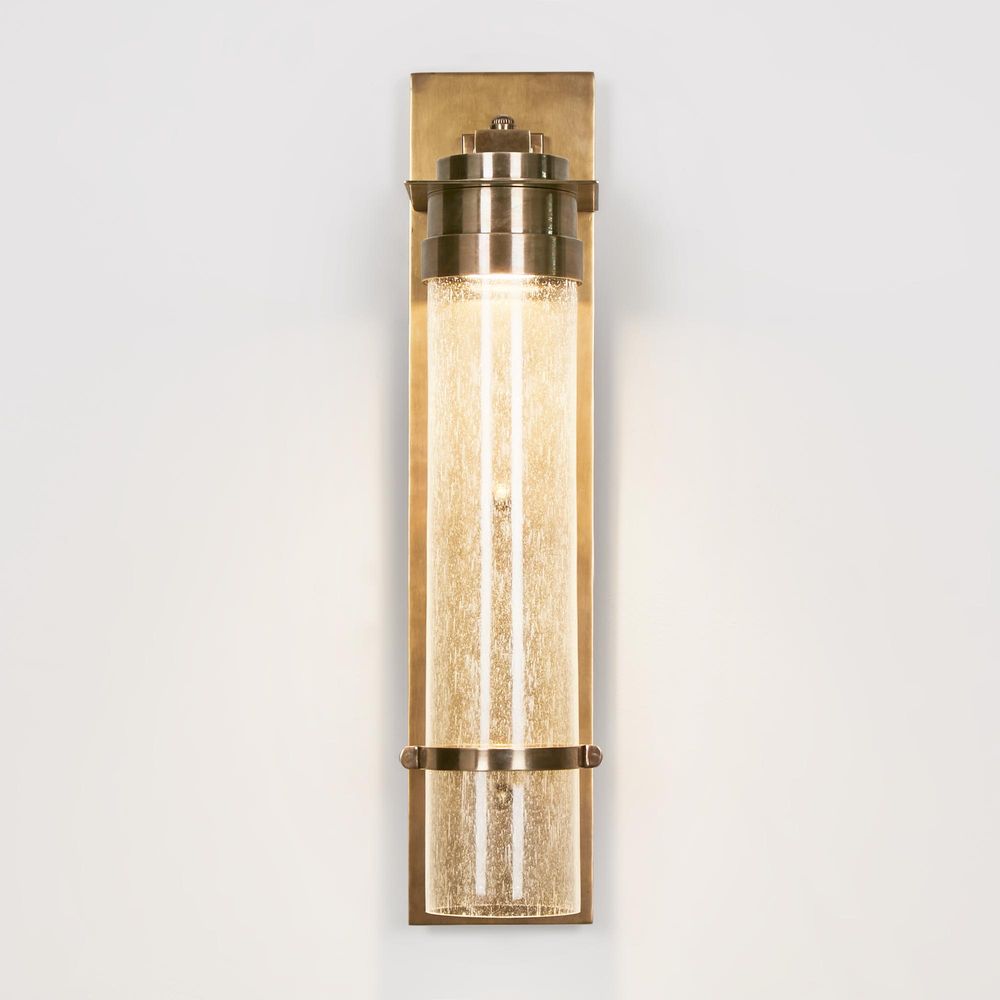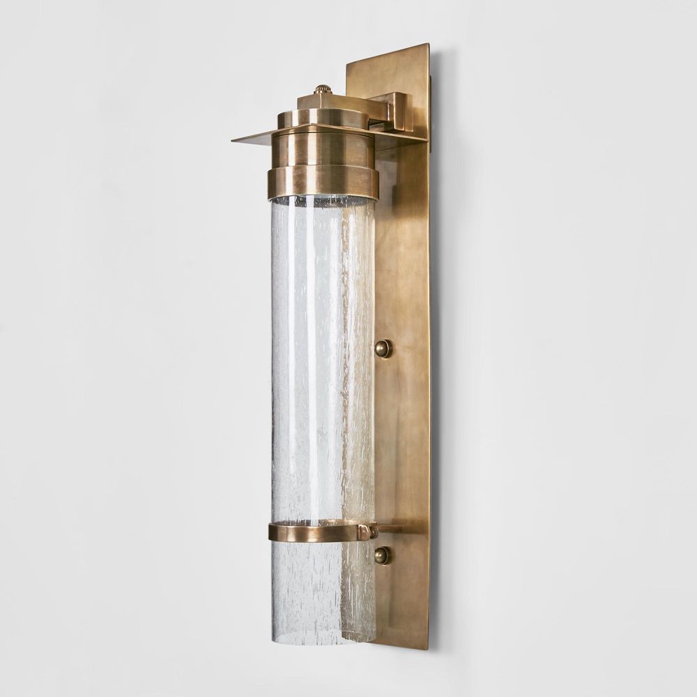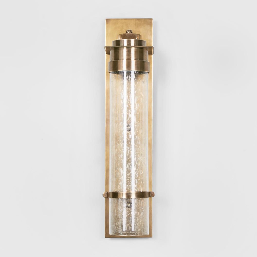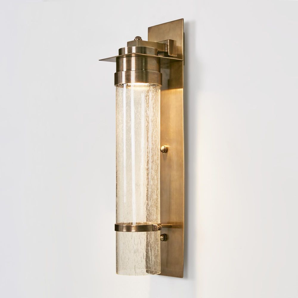 Brighten up your outdoor haven with our Sea Cottage Outdoor Wall Light. Crafted with antique brass and featuring a rectangular backplate, this fixture holds a cracked cylinder glass, evoking the allure of seaside cottages. Whether adorning outdoor entryways or creating a serene oasis in your backyard, let the Sea Cottage Wall Light illuminate your evenings with sophistication and style, capturing the essence of coastal allure in every glow.