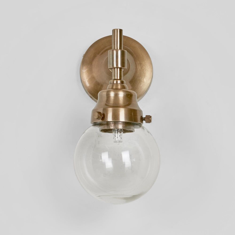 The lamp has a glass round shape and is attached to a wall mount that allows it to be fixed securely to a wall. The light source is enclosed within a clear glass shade that bright the light, creating a warm and inviting ambiance.