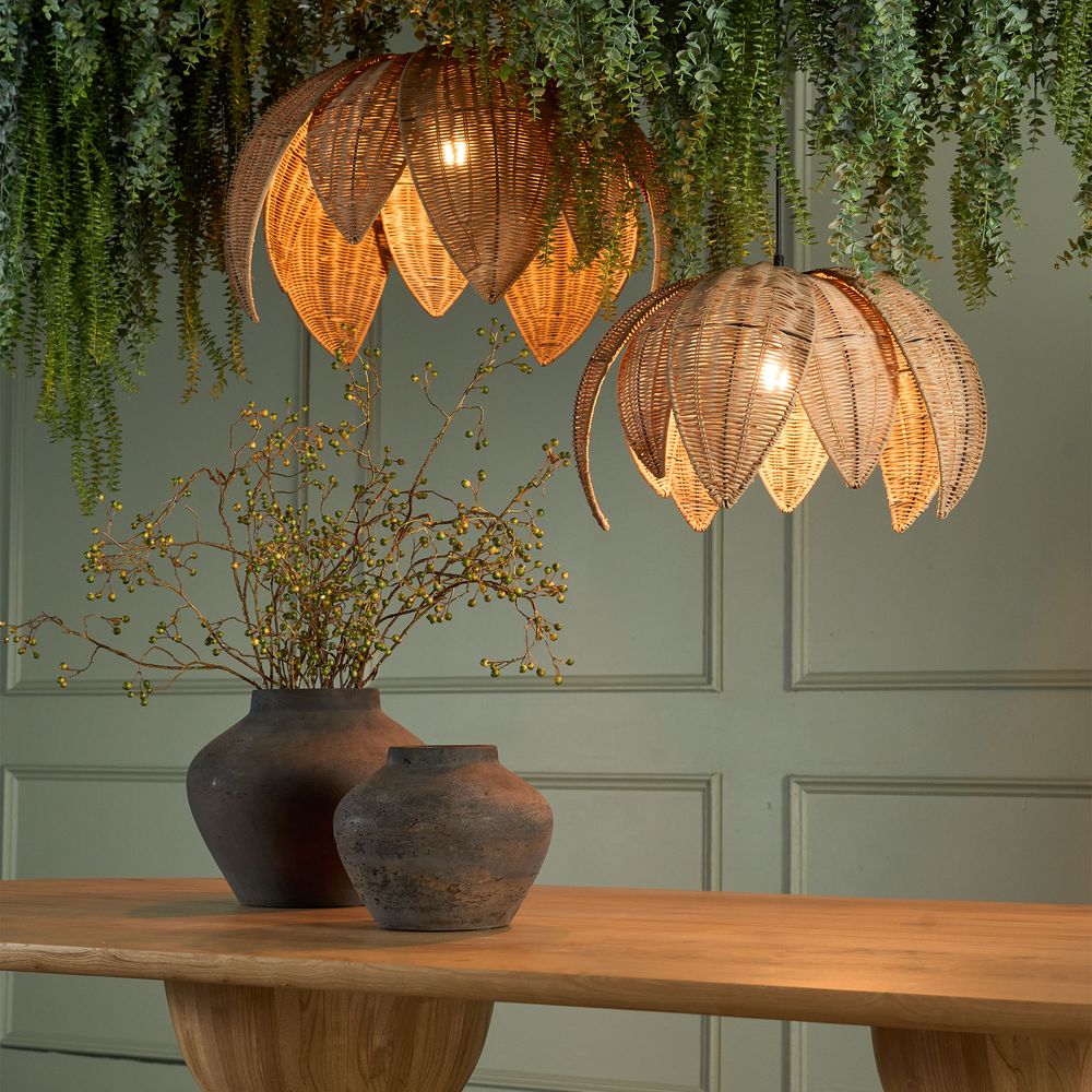 Introducing the Bali Large Pendant in Natural Rattan, a stunning piece that combines unique design, artisanal craftsmanship, and natural materials. This pendant light features a distinctive leaves design and is handwoven from rattan, making it a statement addition to any space. Key Features: Unique Leaves Design: The Bali Large Pendant boasts a beautiful and unique leaves design that adds a touch of nature-inspired elegance to any room. The intricate pattern creates a captivating play of light and shadow, enhancing the ambiance of your space. Handwoven Rattan: Crafted from high-quality, handwoven rattan, this pendant light showcases the artistry and skill of traditional craftsmanship. The natural rattan material adds warmth and texture, making it a versatile piece that complements various interior styles. Statement Light: Designed to be a focal point, the Bali Large Pendant is perfect for creating a statement in any room. Whether hung in a living room, dining area, bedroom, or entryway, it instantly elevates the décor with its eye-catching design. Natural Finish: The natural finish of the rattan enhances its organic beauty and ensures that each piece is unique. The earthy tones blend seamlessly with a variety of color schemes, adding a touch of nature to your home. Versatile Use: Ideal for both residential and commercial spaces, this pendant light can be used in various settings, including living rooms, dining rooms, kitchens, bedrooms, and even outdoor covered areas. Its versatile design makes it suitable for different applications. Easy Installation: The Bali Large Pendant comes with all necessary hardware for easy installation. The adjustable cord allows you to customize the hanging height to suit your space and preferences. Eco-Friendly Material: Made from sustainable rattan, this pendant light is an eco-friendly choice for environmentally conscious consumers. The natural material is not only beautiful but also sustainable, making it a responsible addition to your home. Elevate your interior with the Bali Large Pendant in Natural, where unique design meets artisanal craftsmanship. Enjoy a statement piece that brings natural beauty and a warm, inviting glow to any space.