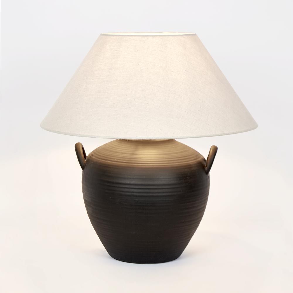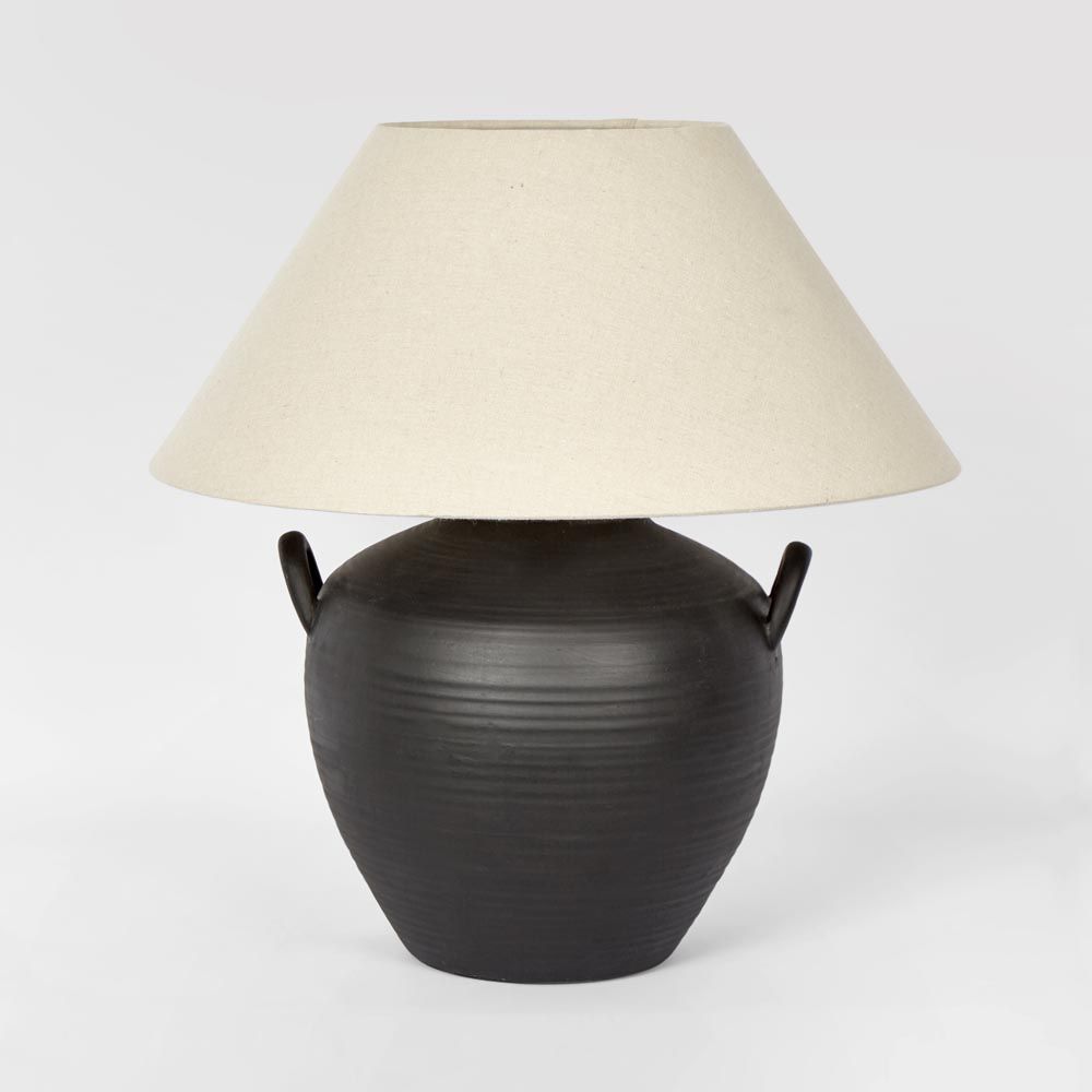 Camille Black Table Lamp & Shade crafted from ceramic, offering a versatile charm. This piece is suitable for various settings.