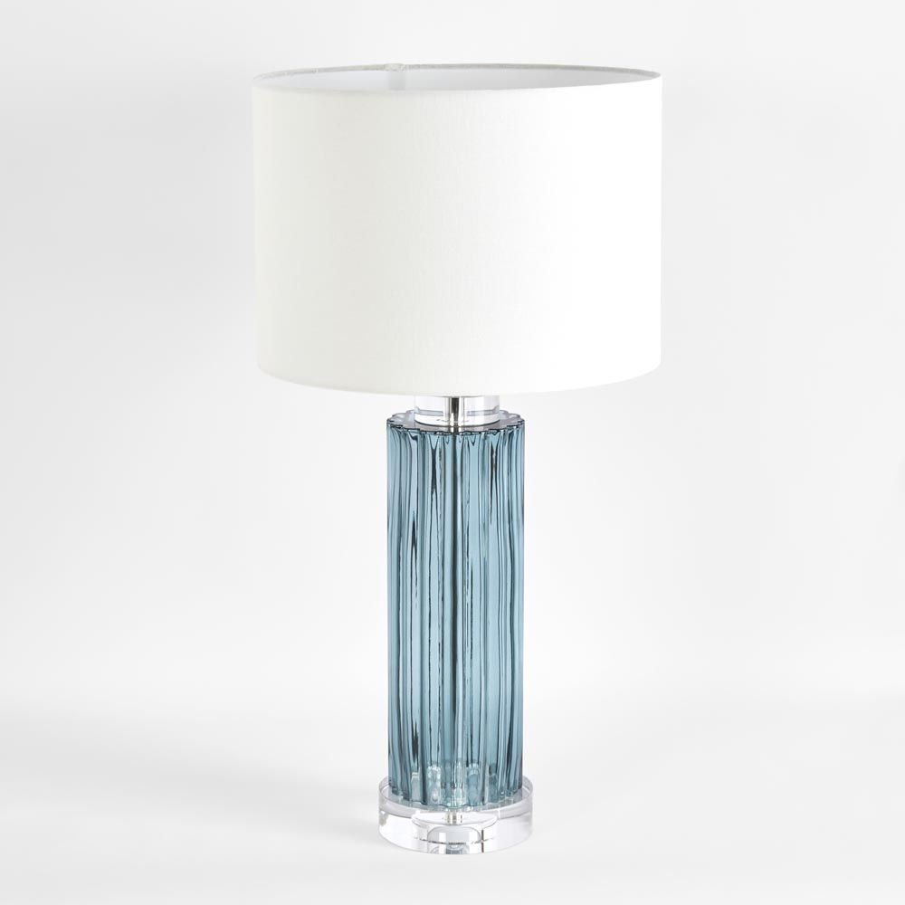 Serento Blue Glass Table Lamp & White Shade crafted from GLASS , CRYSTAL & METAL, offering a versatile charm. This piece is suitable for various settings.