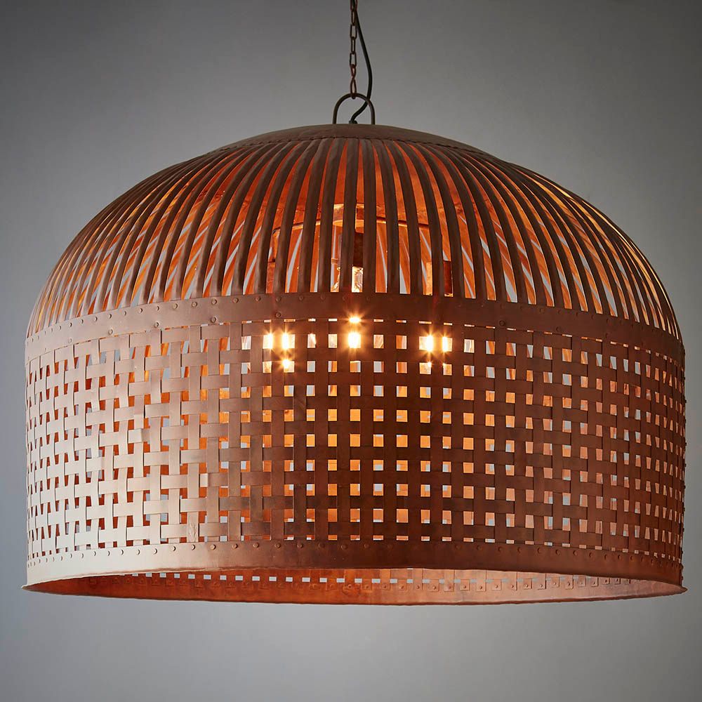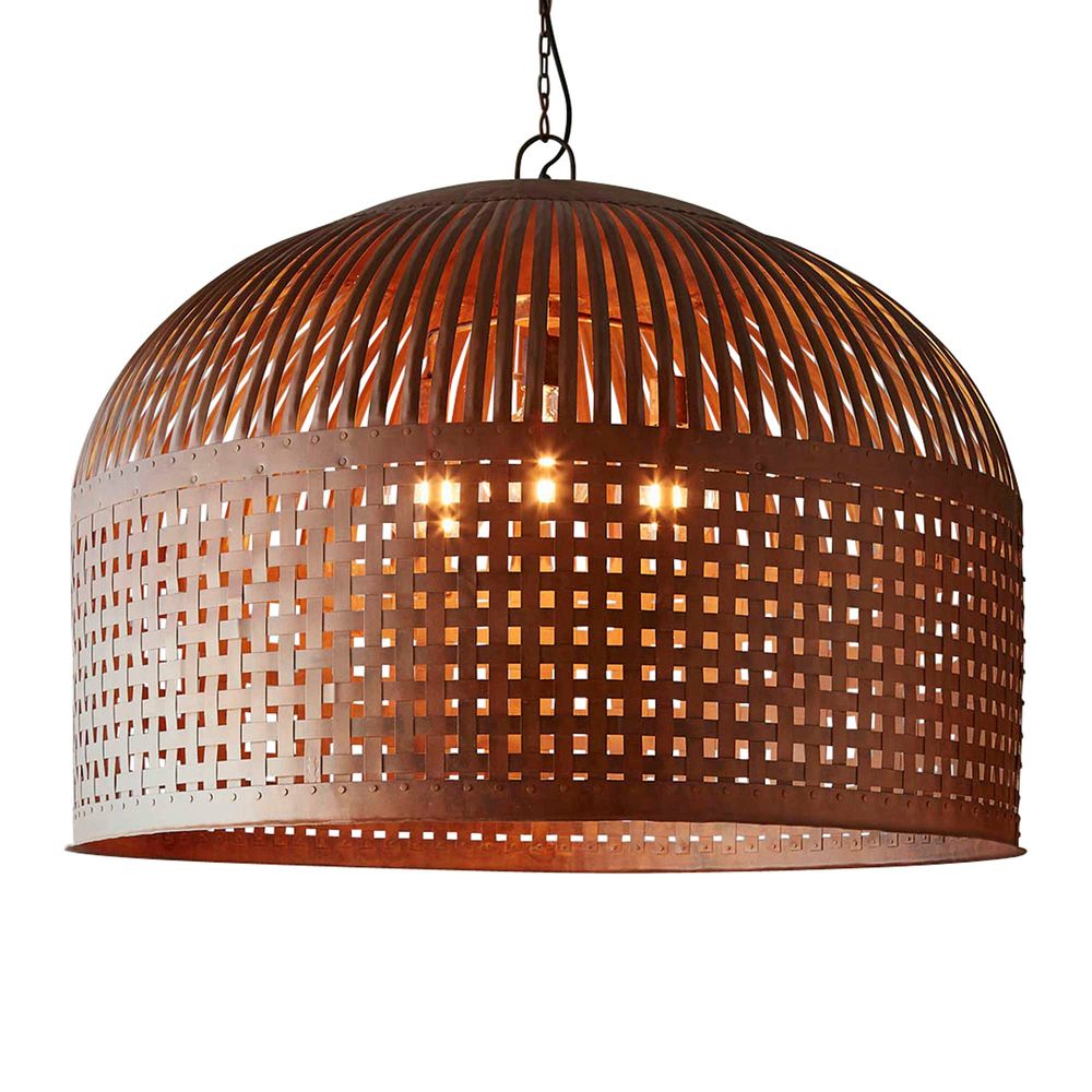 Esch features individual lengths of iron strips that are woven together and held in place by rivets, suspended beneath a graceful dome.