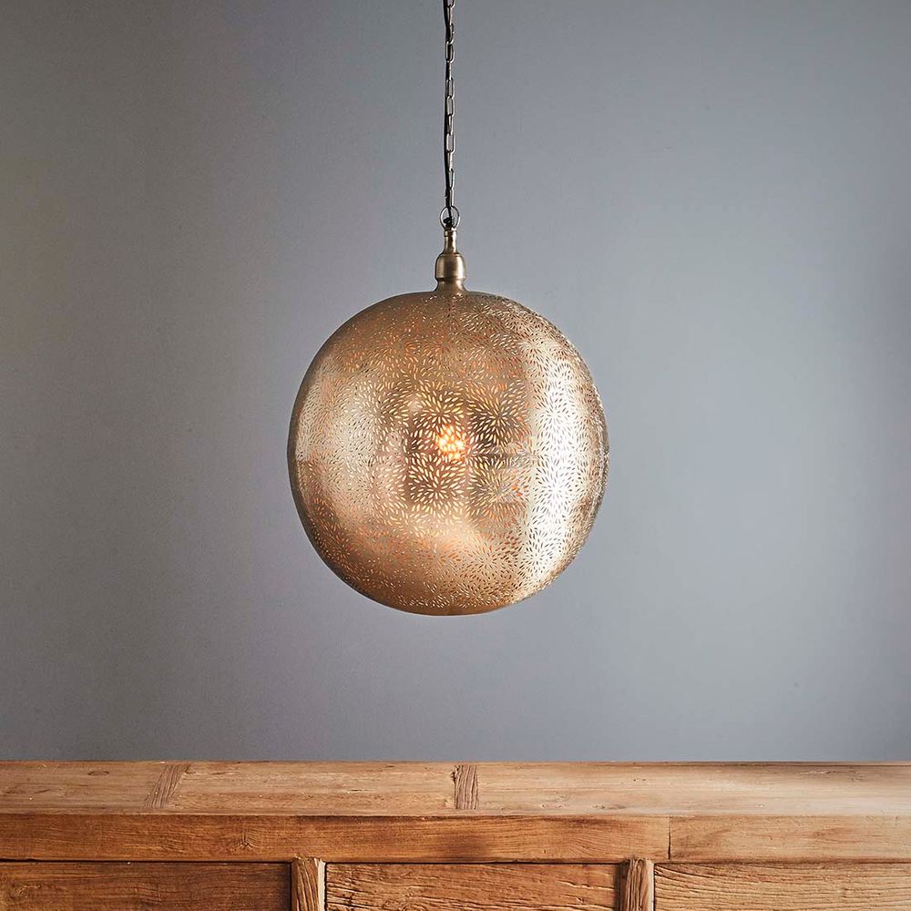 When unlit the metallic silver exterior shows the delicate perforations, when illuminated the glowing gold interior radiates out.