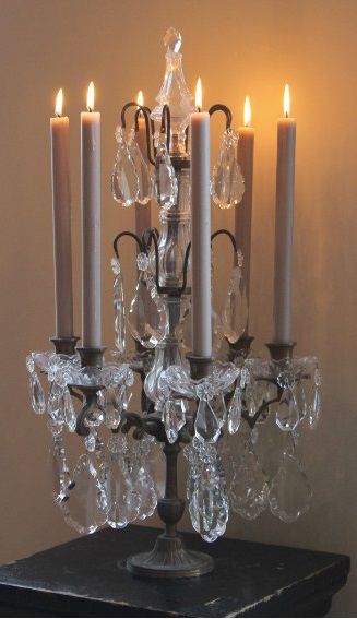 Estella small candelabra is a magnificent piece of french designed décor. It is handmade from crystal glass and heavy burnished brass. It makes an extraordinary centrepiece, it has 6 taper candle holders and several hanging glass chandelier crystals hanging at different height arms to draw in the light. It is a classic french piece of decor for your formal dinning table or would look incredible on a mantlepiece of entrance table for your entrance hall. INDOOR USE ONLY. CLEAN CAREFULLY WITH A DAMP CLOTH.