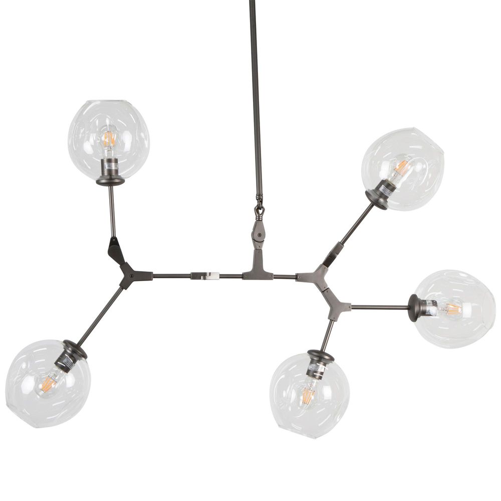 This is replica hanging light from Lindsey Adelman design featuring branch bubble pendant with 5 heads in gunmetal grey color. The hand-blown glass bubbles are connected by the brass swivel joints and elbow. It is an iconic statement piece to feature in a space and its abstract from adds a contemporary and eye-catching element to the ceiling. The fixture can stay simple or it can be designed to wander or sprawl to fit the space.