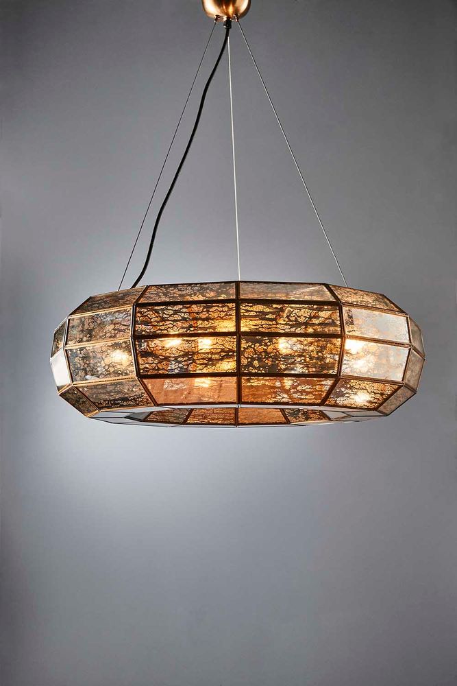 Our Victoria glass hanging lamp is magnificently crafted in a stunning design. This beautiful ring pendant features glamorous mercury mirror glass light with a stunning bronze metal cage and will be perfect statement piece for living space. Crafted from mercuried glass, it offers two different looks when switched on or off. Light shines through the distress accents in the glass to create glowing effect. The suspension cord is adjustable with metal string to ensure this pendant is hung levelled.